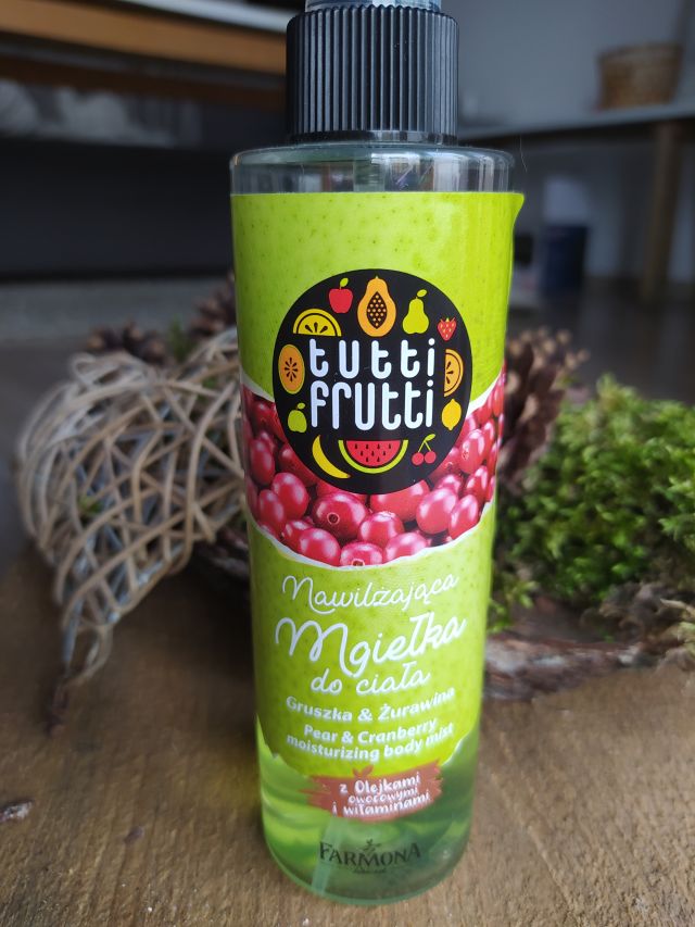 Nawilżająca mgiełka do ciała Tutti frutti o zapachu gruszki i żurawiny. Kupiłam ją za bardzo niską cenę w osiedlowym sklepie. Uwielbiam mgiełki z tej firmy, zawsze powalają zapachem. Używam kilka razy dziennie. Mgiełka jest bardzo wydajna, dobrze nawilża Jedna z moich ulubionych