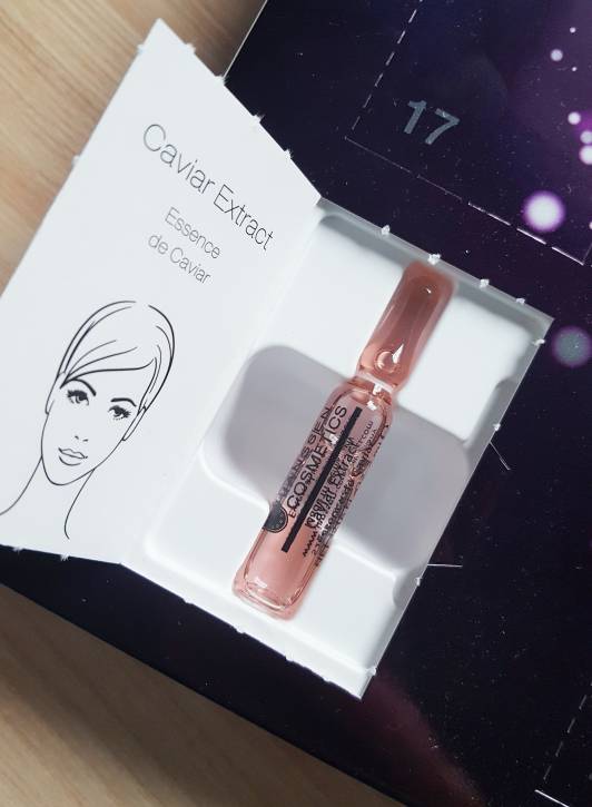 Pierwsze okienko kalendarza adwentowego Janssen Cosmetics zawiera szklaną ampułkę Caviar Extrakt. Zawiera ona 2 ml serum w kolorze różowym. Serum ma za zadanie regenerować i nawilżać skórę, a także zabezpieczać przed szkodliwym działaniem promieni UV. W składzie znajdziemy specjalny wyciąg pozyskiwany z zooplanktonu Artemia Saline, który przywraca skórze dobrą kondycję. Pobudza metabolizm tkanki skórnej oraz syntezę kolagenu, keratyny i filagryny. Ekstrakt z kawioru silnie nawilża i stymuluje do produkcji nowych komórek. Ogólnie serum ma za zadanie zapobiec przedwczesnemu starzeniu się.