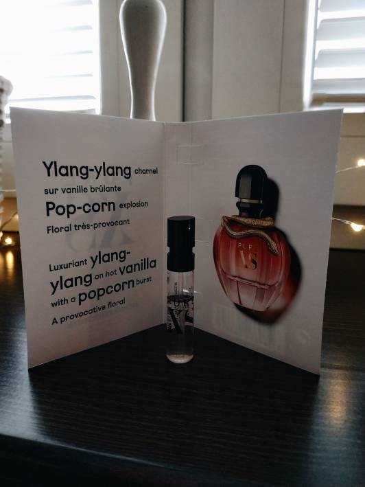 Perfumy Paco Rabanne Pure XS. Wybrałam tą próbkę perfum, ponieważ Paco Rabanne ma nuty zapachowe, które najbardziej mi odpowiadają. Pure XS zaciekawił mnie połączeniem mojego ulubionego zapachu wanilii z zapachem popcornu. Kwiatowo orientalną nutę zapewnia ylang-ylang. Jeśli chodzi o owoce są to bardzo wyczuwalna jest pomarańcza, nadaje orzeźwiającego aromatu perfumom. Można również się doszukać zapachu brzoskwini i kokosa. Całe perfumy są na bazie drzewa sandałowego i dzięki temu są trwałe i długo pozostają na ciele. Myślę, że mogłyby być moimi perfumami w zastępstwie za Olympea.