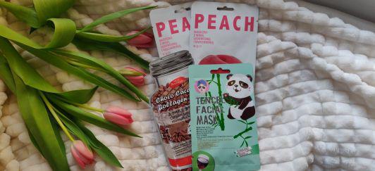 Maseczki od PUREDERM, których jakiś kilka dobrych miesięcy temu używałam. Mam tu trzy różne wersje, czekoladowo - kakaową , malinową oraz ogórkową. Wszystkie są kolagenowe, ślicznie pachną i kosztowały mnie po ok 4zł za sztukę . Przyznam, że wszystkie wspaniale wpłynęły na moją skórę - czułam że była odprężona, wypoczęta i idealnie nawilżona. Ich płachty była fajnie nawilżone, nie spływało mi nic po szyi. Materiał pałacht był milutki i super się ją nakładało bo i fajnie pasowały na twarz. Bardzo chętnie po nie sięgnę znów, polecam serdecznie .