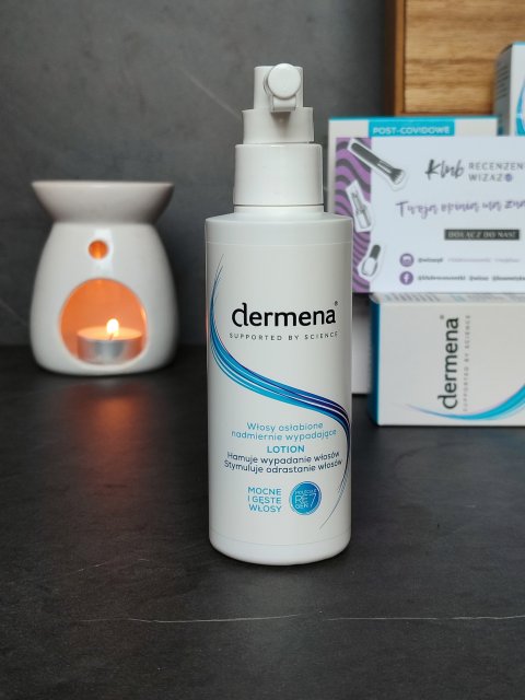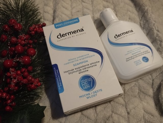 Szampon do włosów Dermena. Kupiłam go w aptece, zachęcona pozytywnymi opiniami i przez farmaceutkę. Szampon ma pojemność 200 ml i kosztował 20 zł. Ma ponoć bardzo mocne działanie, jest przeznaczony nawet dla osób hemioterapii. Ja już po kilku użyciach zauważyłam pierwsze efekty, ale biore dodatkowo także wzmacniające tabletki.