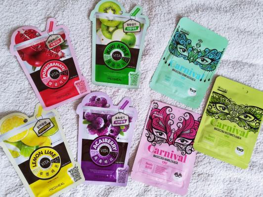 Maska nawilżająca Carnival, Muju. Przyznaję od razu, że kupiłam ze względu na wygląd. To opakowanie od razu przypadło mi do gustu. Maseczka jest baaardzo mocno nasączona, esencja z niej kapie i wystarczyło jej na dekolt i szyję. Maska ma ładny wzorek maski karnawałowej. Bardzo ładnie nawilżyła skórę i wyrównała jej koloryt. Zapach delikatny (albo źle czułam, bo miałam wtedy katar;D). Po zdjęciu skóra nieco się lepiła, ale warto było, bo prezentowała się całkiem ładnie.