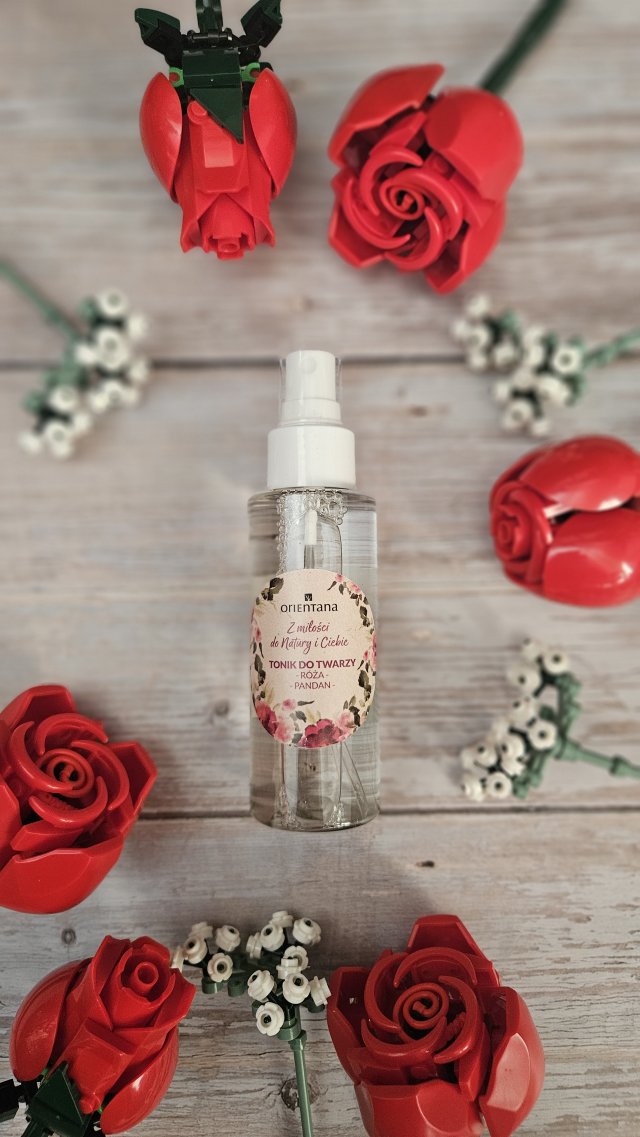 Orientana, tonik do twarzy Róża Japońska i Pandan. Tonik zamknięty jest w poręcznej butelce z atomizerem. Pozwala uzyskać delikatną mgiełkę, nie pluje jak czasem się to zdarza. Tonik nie zawiera alkoholu, jest delikatny, naturalny i ma świetny skład. Zapach dość intensywny, bardzo przyjemny. Stosuję go rano i wieczorem delikatnie wklepując w skórę twarzy, szyi i dekoltu. Kosmetyk fajnie nawilża i wycisza skórę, dodatek róży działa przeciwstarzeniowo, a pandan normalizująco. Pandan (azjatycka wanilia) to roślina mająca szerokie zastosowanie w kuchni azjatyckiej i kosmetologii. Butelka ma pojemność 100 ml, a przez to że jest w formie sprayu, tonik jest wydajny.