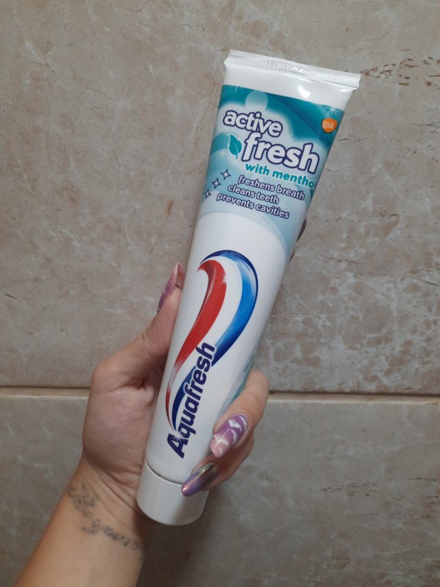 Kosmetyk do higieny jamy ustnej aquafresh triple protection fresh & minty. Jest to pasta która ma w swoim składzie mięte, ma on w swoim składzie fluor. Pomaga zapewnić utrzymanie zdrowych dziąseł oraz mocne zęby i świeży oddech. Bardzo przyjemna pasta nie czuć bardzo mięte taka przyjemna bardzo polecam. W opakowaniu znajduje się 125 ml pasty. Nie podrażnia skóry z czego ogromnie się cieszę. Wystarcza na dość długi czas użytkowania.