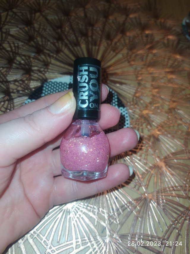 ❌ Ogólnie lubię lakiery z Miss Sporty, ale ten okazał się totalnie beznadziejny. Szukałam lakieru lekko zabarwionego na różowo, z brokatem. Liczyłam, że płytka będzie śliska. Lakier okazał się chropowaty. Ma kolor różowy i sporą ilość brokatu. Nie ma jednak żadnego połysku. Po użyciu lakieru paznokieć jest matowy i zostawia chropowaty brokat. Jest to bardzo nieprzyjemne uczucie, bo czułam że o wszystko "zahaczam". Buteleczka prezentuje się obiecująco. Widać różowy środek. Ma czarną zakrętkę. W środku znajduje się 7 ml lakieru. Na pewno nie kupię lakieru z serii Crush On You.