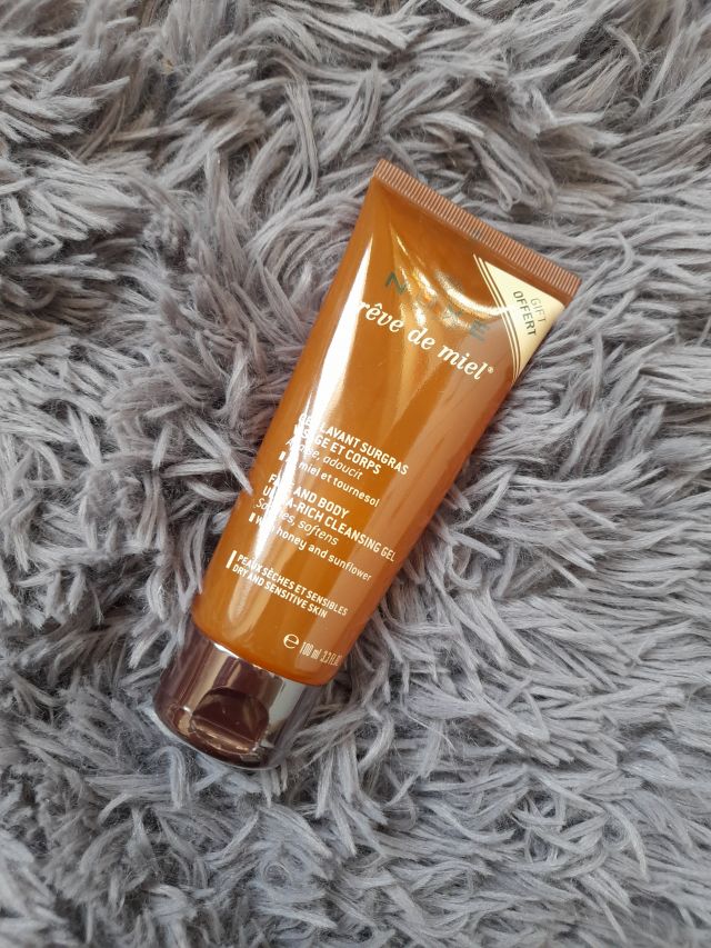 Pierwszą miniaturą jest ultra-bogaty żel do mycia Nuxe Reve de Miel o pojemności 30 ml, przeznaczony głównie do skóry suchej i bardzo suchej. Zawiera 92% składników pochodzenia naturalnego, można go stosować do mycia twarzy jak i ciała. Ma gęstą konsystencję, która dobrze się pieni. Bardzo dobrze oczyszcza skórę, nie wysuszając jej przy tym. Stosowałam go zarówno do mycia twarzy jak i ciała, i w obu tych przypadkach dobrze się sprawdzał.