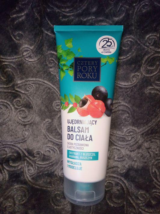 Ujędrniający balsam do ciała firmy Cztery Pory Roku. Zawiera ekstrakt z bluszczu, guarany i ruszczyku. Jest do skóry pozbawionej elastyczności. Balsam wygładza i modeluje skórę. Jest lekki i ma delikatna konsystencję, która dość szybko wchłania się w skórę. Zamknięty w standardowej plastikowej tubie.