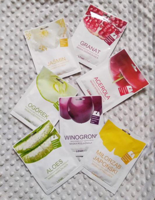 Maseczki w płacie które kupiłam w Hebe. Dostępnych było wiele wersji, ale ja zdecydowałam się na trzy, acerole, ogórka oraz winogrono, które mają działanie regenerujące, rozjaśniające oraz ujędrniające. Są to maseczki firmy LomiLomi i powiem wam, że pierwszy raz spotykam się z tą marką kosmetyków, a że nie były drogie to skusiłam się do ich przetestowania. Maseczki mają ładne delikatne zapachy i są bardzo mocno nasączone, a tkanina z której są wykonane jest bardzo delikatna i dobrze wycięta przez co ładnie się dopasowuje i trzyma na twarzy. O dokładnym działaniu każdej maseczki opowiem, Wam później, ale już teraz powiem, że naprawdę warto na nie zwrócić uwagę.