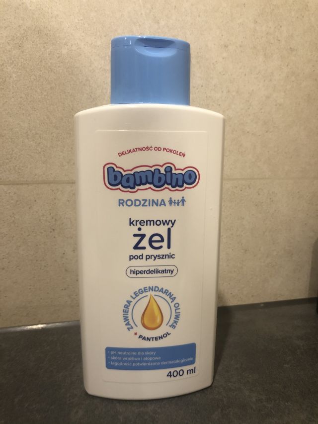 Bambino Rodzina, Hiperdelikatny żel pod prysznic z oliwką. 400 ml żelu w cenie 20 złotych. Zamknięto w biało niebieskim opakowaniu, pratycznym, zamykanym z małą dziurką, nic się nie wylewa. Kolor mleczny, nie barwi wody. Zapach przyjemny, delikatny i puchaty. Bardzo delikatny, ale przenoszący się na ciało. Żel dokładnie myje ciało. Nie uczula i nie podrażnią. Pozostawia skórę gładką ,jedwabistą i nawilżoną. Jestem z niego bardzo zadowolona. Od kiedy używam nie czuję potrzeby nacierania się balsamami. Świetny produkt.