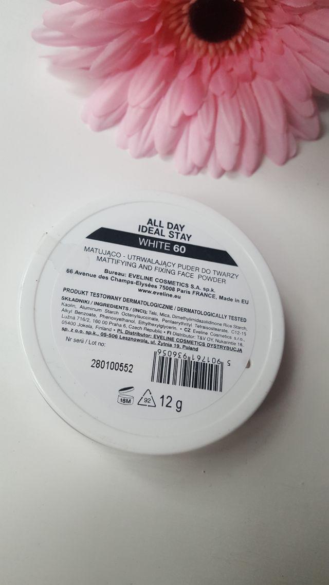 Eveline, All Day Ideal Stay, matująco-utrwalający puder do twarzy, który bez promocji kosztuje 21,39 zł. Jest to puder ryżowy, które bardzo dobrze matowi twarz na cały dzień i przedłuża trwałość makijażu. Jest on transparentny, przez co nie zmienia koloru podkładu. Nie podkreśla suchych skórek i bardzo ładnie stapia się ze skórą. Nie tworzy efektu ciasteczka na twarzy.