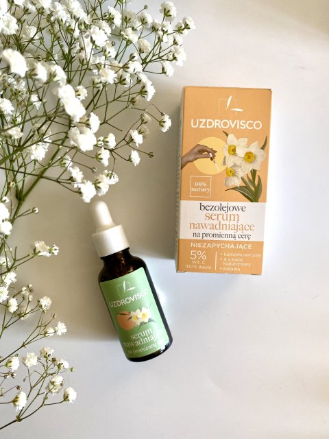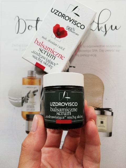 Szukając co pisze o tym serum producent, zdziwiłam się widząc podkreślone wielkimi literami stwierdzenie "bez zapachowy", bo ja zapach wyczuwam od samego początku i to taki "lekowy". Nie jest najprzyjemniejszy, ale odrzucający też nie - szybko się ulatnia ze skóry. Konsystencja kosmetyku jest dość lepka i początkowo tak też zachowuje się na skórze, lecz po chwili wszystko całkowicie się wchłania. W przypadku tego produktu bardzo liczyłam na regenerację zaczerwienień i ujednolicenie kolorytu (miałam kilka zawirowań skórnych przed rozpocząciem przygody z uzdroviskiem) i się nie zawiodłam. Wszelkie pozostałości po zmianach oraz drobnych krostkach się złagodziły i moja skóra bez makijażu wreszcie wygląda dobrze. Ujędrnienia i poprawy elastyczności nie jestem w stanie zauważyć, bo jeszcze tego nie potrzebuję, choć mam nadzieję, że używanie tego typu kosmetyków zaplusuje na przyszłość.