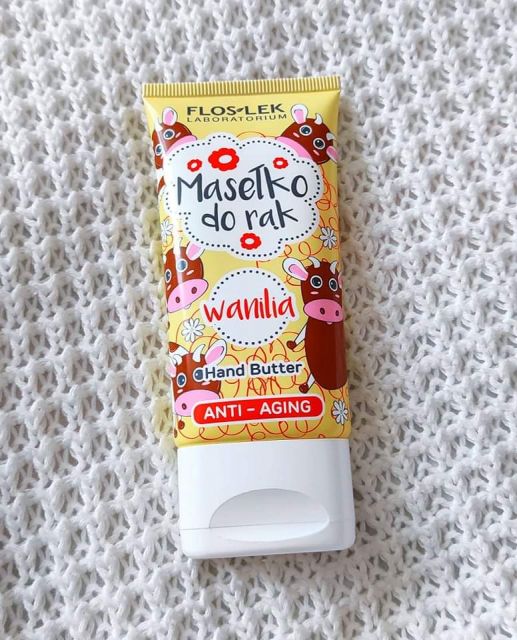 Floslek waniliowe masełko do rąk anti aging. Pierwsze co przyciągnęło moją uwagę to przeurocze opakowanie z krówkami 🐄. Kosmetyk zawiera 92% składników pochodzenia naturalnego min. okej że słodkich migdałów i i olej z Luffa Cylindrica.