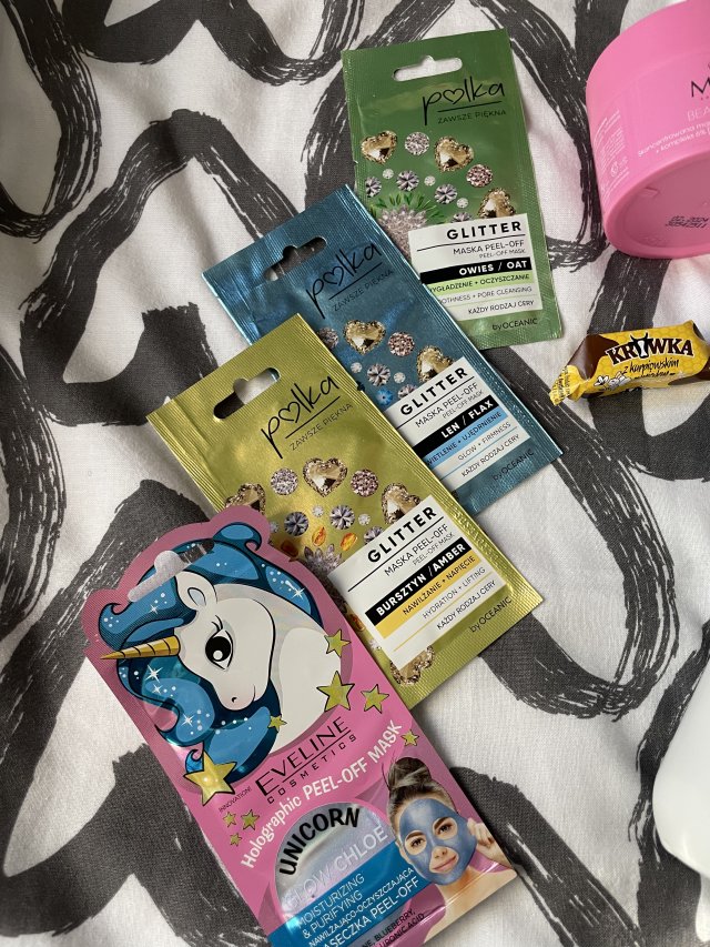 Polka, Glitter, Maska do twarzy, Peel-off, Rozświetlenie + ujędrnienie, Len. Maseczkę tą dorwałam jakiś czas temu w Lidlu za 2.50zł. Ogromnie spodobała mi się pod każdym względem. Maseczka ma prześliczną grafikę na opakowaniu, sama maseczka jest lekko żelowa, myślałam że będzie gęsta ale jest bardzo rzadka i źle się jej używa bo się wylewa z saszetki. Jej zapach jest ogromnie przyjemny. Szybko wysycha co mnie bardzo zaskoczyło. Fajnie nawilżyła, wygładziła moją skórę. NIe zauważyłam aby była rozświetlona ale jędrna na pewno. Chętnie bym do niej wróciła bo zdjęcie jej z buzi jest też bardzo proste .