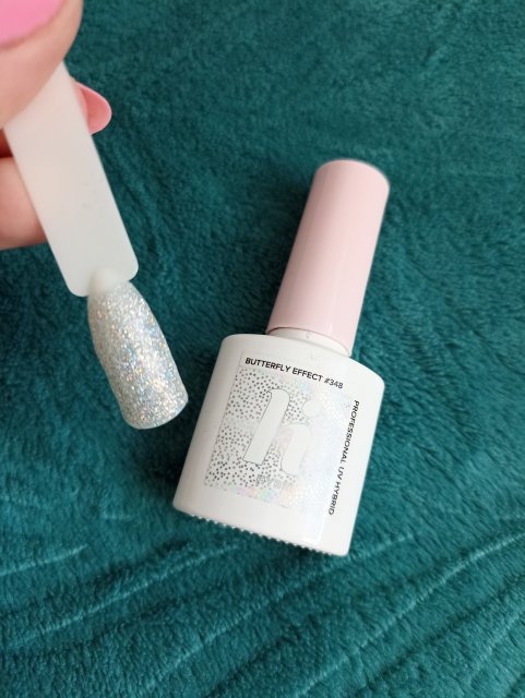Kolejny lakier od HiHybrid, tym razem z serii Butterfly, kolor 348 czyli efekt motyla. To poltransparenty brokat mieniący się w wielu kolorach, w zależności od tego na jaki lakier go nałożymy i jak pada światło. Tutaj nałożyłam go na czarny wzornik, wystarczyła jedna warstwa.