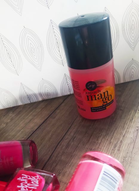 Seyo, Zmywacz do manicure hybrydowego, ma on przyjemny zapach mango, który jest dość dobrze wyczuwalny. Ja ściągam sobie hybrydy za pomocą nasączonego zmywaczem wacika, następnie dociskam go klipsem. Bardzo dobrze odmacza lakier, dzięki temu w łatwy sposób można się go pozbyć z naszych paznokci, a resztki usunąć patyczkiem bambusowym.