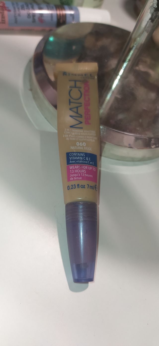 Korektor Rimmel Match Perfection rozjaśniający z pędzelkiem. Jak widać korektor już niestety się skończył. Korektor jest o pojemności 7ml. Jest super, ma świetną konsystencję, zakrywa niewielkie cienie pod oczami, ładnie rozświetla, długo utrzymuje się na twarzy. Jego cena w Rossmannie to około 32zł.