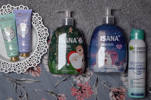 Zużyłam kilka pełnowymiarowych produktów, i w sumie wszystkie mi się dobrze sprawdziły. Miałam tu pięknie pachnące zimowymi aromatami żel pod prysznic z LaQ oraz mydło do rąk z Isany. Mydło kupiłam już po raz drugi, a żel mam też w zapasie, więc jeszcze trochę będę mogła się nim pocieszyć. Muszę przyznać że ten żel był genialny, dobrze nawilżał i zapach bardzo długo się trzymał. Bardzo lubiłam też szampon z Stars from The Stars, dobrze oczyszczał i był przy tym delikatny. Pianka do twarzy z Isany była okej, może nie najlepsza z tych które testowałam ale i tak była w porządku. Lakier do włosów świetnie mi się sprawdzał do utrwalania loków i fal, jest delikatny i nie tworzy na włosach skorupy. Nie dawała mega mocnego utrwalenia, ale wystarczające na co dzień. Kolejny pełnowymiarowy produkt to krem pod oczy z Bielendy, bardzo dobrze nawilżał i był delikatny dla wrażliwej skóry wokół oczu. Udało mi się zużyć tylko trzy maseczki - tutaj jestem trochę zawiedziona, liczyłam na więcej bo tu mam największe zapasy. Zużyłam tez dwie miniaturki, kropelki z kolagenem oraz pastę do zębów.