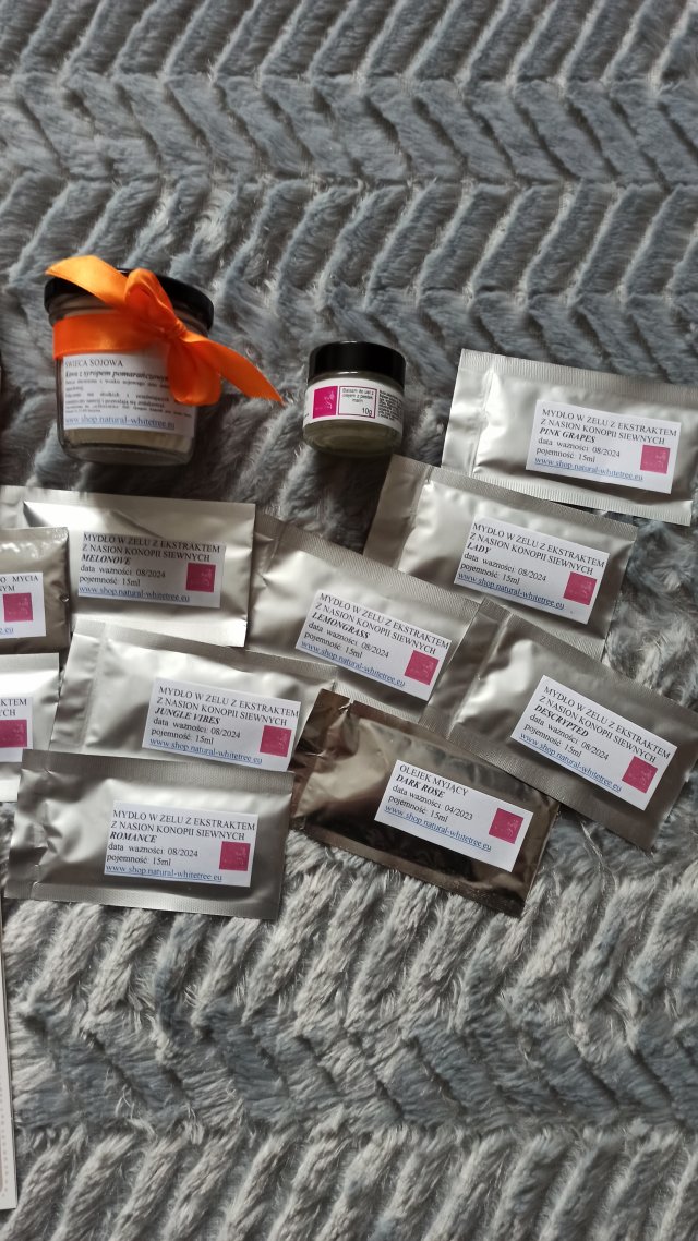 Próbka mydła w żelu z ekstraktem z nasion konopi siewnych Lemon Grass WhiteTree Natural Cosmetics. Mydełko ma bardzo intensywny zapach. Pachnie faktycznie trawą cytrynową. Zapach bardzo mi się podoba. Konsystencja mydła jest gęsta i dobrze się pieni. Bardzo dobrze oczyszcza dłonie i fajnie je nawilża. Pozostawia dłonie pięknie pachnące.