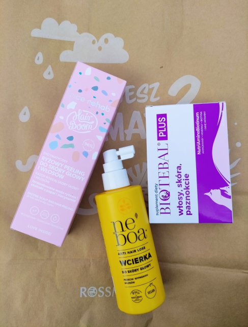 Tym razem przy okazji zakupów w Rossmannie skusiłam się na ryżowy peeling do skóry głowy od HairBoom. Zarówno butelka jak i kartonik, w jaki jest zapakowana są w różowym kolorze. Butelka jest plastikowa i ma coś w rodzaju pipety, którą nakładamy kosmetyk na skórę głowy. Peeling ma bardzo delikatny zapach i raczej rzadką konsystencję. Ma szczęście nie ucieka z włosów w trakcie nakładania. Na pewno oczyszcza skórę głowy ale innych efektów nie zauważyłam.