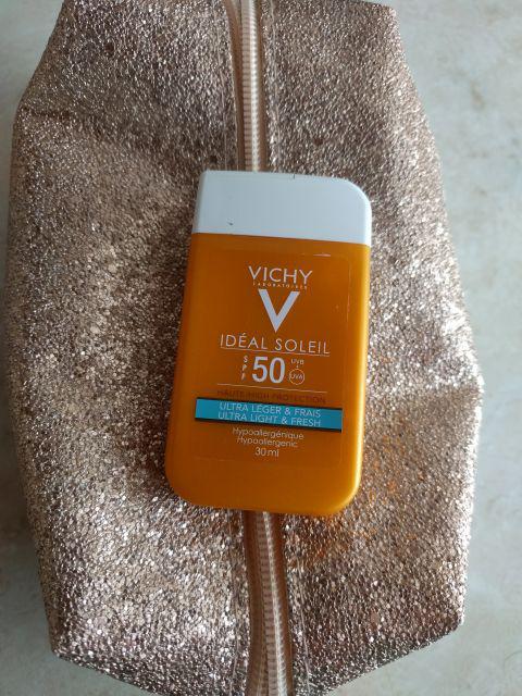 Vichy Ideal Soleil , czyli krem ochronny z filtrem SPF50. Kupiłam go z zamiarem używania go do twarzy i tutaj sprawdza się świetnie. Ciężko znaleźć krem z filtrem po którym twarz nie będzie się błyszczeć, ale ten daje radę. Nie zapycha skóry, co też jest dużą zaletą. Jest to mała pojemność - 30 ml, ale absolutnie wystarczająca. Zapłaciłam za niego ok. 30 zł w aptece internetowej.