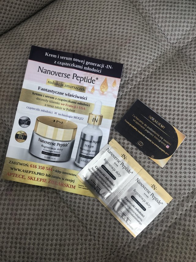 In, nanoverse peptide, serum, regeneracja skóry, redukcja zmarszczek, cząsteczki młodości. Próbkę dostałam jako dodatek do wymiany kosmetycznej. Byłam bardzo ciekawa próbki, bo peptydy to składnik, który chcę mieć w swojej pielęgnacji. Produkt miał jak dla mnie nieprzyjemny zapach. Drażnił mnie. Jeśli chodzi o efekt na skórze to była ona lekko lepka, nie przyjemna w dotyku. Wolę sera, które albo są żelowe i szybko się wchłaniają albo które delikatnie nawilżają, a tu niestety nic z tego nie miało miejsca.