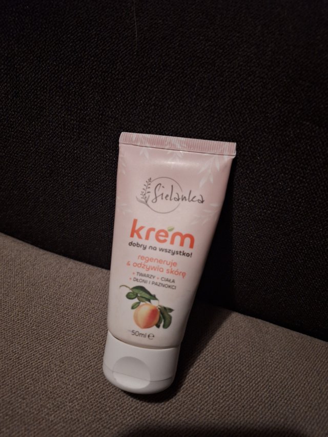 13. Sielanka, Krem dobry na wszystko, miał przyjemny brzoskwiniowy zapach oraz lekką konsystencję. Skóra po jego użyciu była miękka, odżywiona oraz dobrze nawilżona.