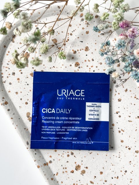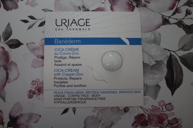 Uriage Bariederm CICA, próbka Krem regenerujący z Cu-Zn SPF 50, którą dostałam od koleżanki. Przeznaczony jest do skóry z podrażnieniami oraz uszkodzeniami naskórka. W swoim składnie posiada miedź i cynk które łagodzą podrażnienia oraz SPF50, który chroni przed promieniowaniem słonecznym. Krem ma przyjemny zapach, który jest wyczuwalny podczas nakładania go na skórę. Ma on kremową konsystencje, przez co szybko się wchłania. Skóra po jego użyciu jest nawilżona, miękka oraz gładka. Nie wysusza, nie podrażnia oraz nie uczula.