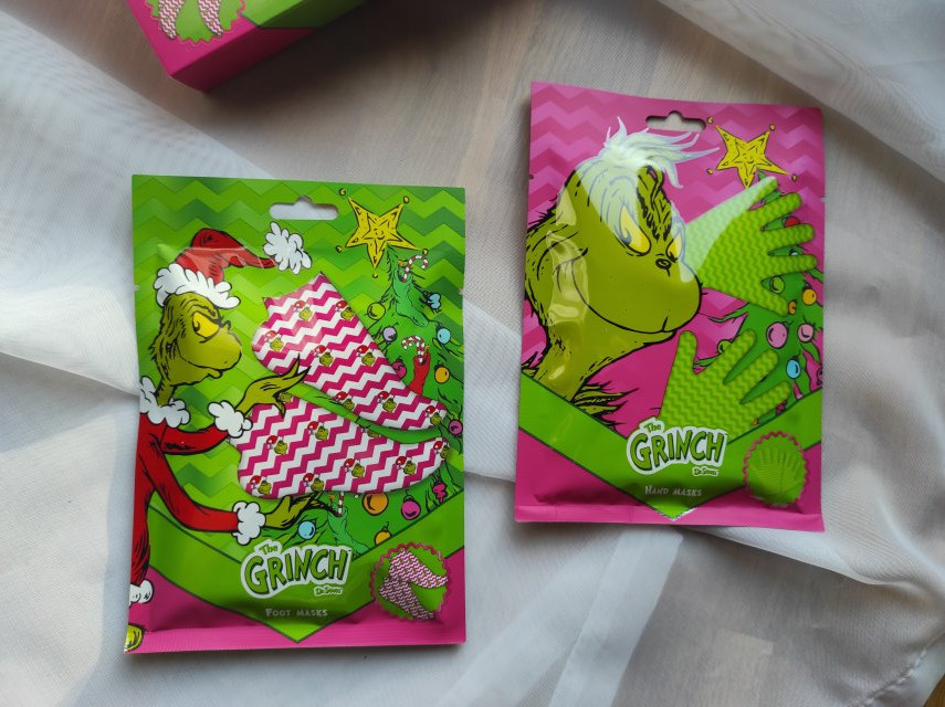 Zestaw ten dostałam w prezencie od koleżanki z pracy. Różowe opakowanie w świątecznym klimacie z motywem Grincha wygląda genialnie. Oprócz tego sama maska przypomina kapcie albo buty Grincha, co wygląda świetnie. W skarpetkach znajduje się dość sporo gęstej maski o troszkę sztucznym zapachu. Maska wzbogacona jest o masło shea. Po ich nałożeniu czułam chłód, który pozostał nawet po użyciu maski.