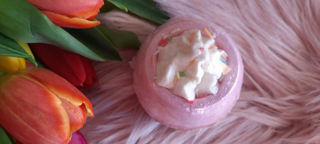 Kula do kąpieli Bomb Cosmetics Flock Star kupiłam ją jakiś czas temu w Auchan. Kosztowała około 8 złotych. Kula pieknie się prezentuje wygląda jak babeczka z flamingiem. Posiada przyjemny ładny zapach ale nie umiem go do czegoś porównać. Kula szybko się rozpuszcza tworząc kremową piankę. Woda ładnie się zabarwia na niebieski kolor. Zapach czuć lekko podczas kąpieli. Po wyjściu z wanny skóra była nawilżona i miękka.