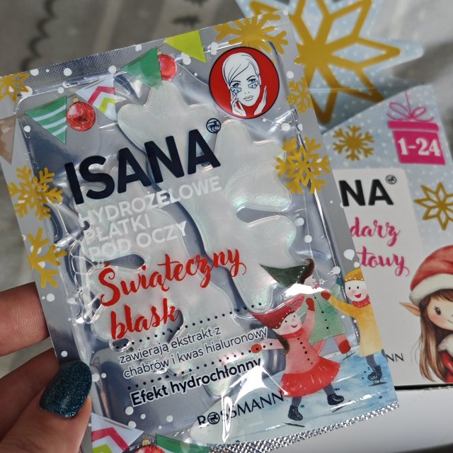 Kalendarz adwentowy Isana dzień 6 mikołajki znalazłam w nim hydrożelowe płatki pod oczy Świąteczny Blask. Opakowanie ma cudowną świąteczną grafikę. Płatki mają kształt śnieżynek. Mają taki ładny holograficzny błysk. Płatki dość dobrze się trzymają ale kształt nie jest taki komfortowy w noszeniu. Po zdjęciu płatków skóra była miękka i nawilżona.